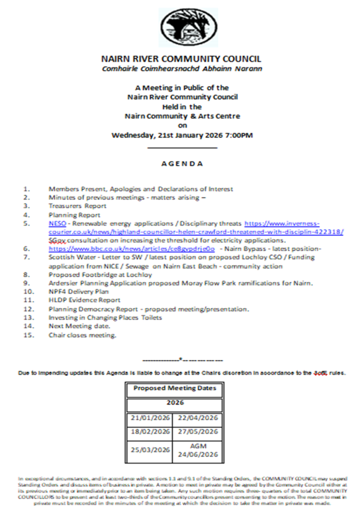 Agenda – Wednesday, 21st January 2026 7:00PM Posted bynairnrivercc218th Jan 2026Posted inNews Share this: Share on X (Opens in new window) X Share on Facebook (Opens in new window) Facebook Like Loading... Related